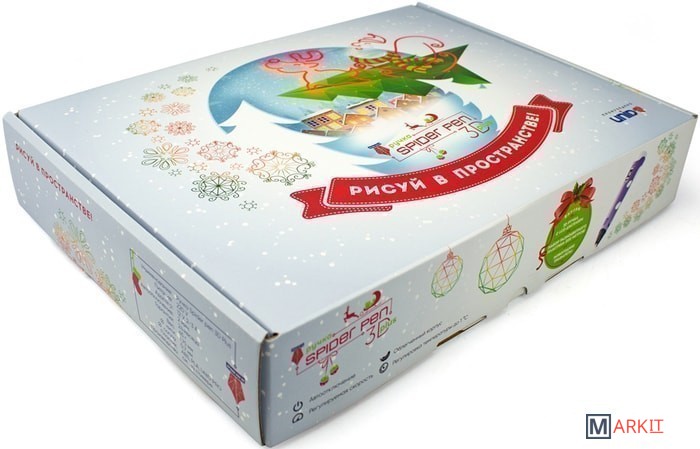| Комплектация | - 3D ручка Spider Pen PLUS;- Книга трафаретов с новогодней тематикой;- 10 цветов пластика PLA (в том числе, светящийся в темноте);- Адаптер питания;- Подарочная красочная упаковка;- Инструкция. |