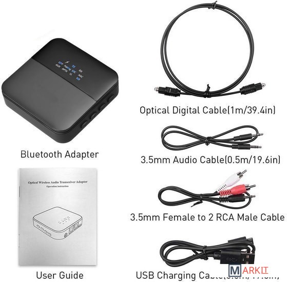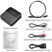 Комплектация 1 х Bluetooth-адаптер1 х кабель для зарядки MicroUSB1 x аудио кабель jack 3.5мм (папа-папа)1 х аудио кабель jack 3.5мм на 2x RCA (папа-папа)1 х цифровой оптический кабель (Toslink/SPDIF)1 x руководство пользователя (на английском)