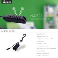 Цифровой датчик температуры и влажности Sonoff AM2301 для устройств удаленного управления и мониторинга.Данный датчик является дополнением (опцией), для использования с устройствами Sonoff TH10/TH16 и снабжен специальным разъемом для подключения к этим устройствам.При управлении выключателем Sonoff TH10/TH16 датчик Sonoff AM2301 позволяет использовать функции, зависящие от температуры и влажности, измеряемые датчиком.Датчик должен быть подключен к Sonoff TH10/TH16, до включения питания модуля. Не рекомендуется подключать или отключать датчик после включения питания.Датчик оснащен кабелем и 2,5 мм. штекером.- Датчик не является водонепроницаемым датчиком.- Для корректной работы датчика температуры AM2301 допускается длина до 60 метров.- Диапазон рабочей температуры: от -40 до +80;- Диапазон рабочей влажности: от 0 до 99.9%RH;- Точность измерения при температуре 25°С (температура): ±0.5%RH;- Точность измерения при температуре 25°С (влажность): ±3%RH(10...90%RH);- Тип сенсора (температура): резистивный датчик;- Тип сенсора (влажность): емкостный датчик;- Напряжение питания: 3.0-5.2V (рекомендуется 5V);- Длина (кабель с датчиком): 0.5 метра;- Максимально расширяемая длина: до 60 метров;- Разъем: jack 2,5мм.;- Размер датчика: 60x30x19 мм;