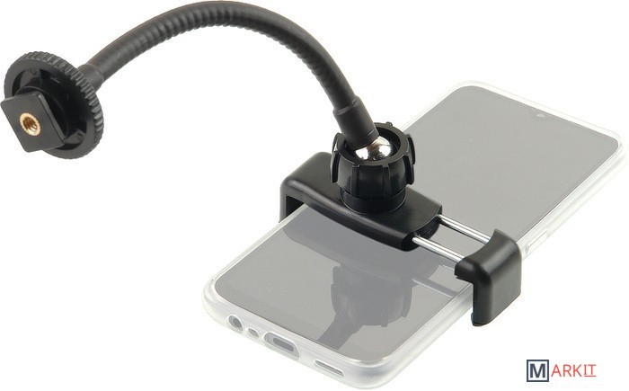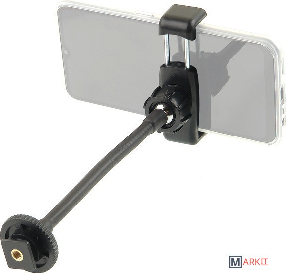 Falcon Eyes PhoneHolder 160F – держатель для смартфона, камера которого используется для фото- или видеосъемки.Металлическая штанга в полимерной оболочке изгибается с существенным усилием, позволяет точно расположить камеру смартфона относительно объекта съемки и стабильно сохраняет выбранное положение.Зажим с подпружиненной лапкой и резиновыми вставками рассчитан на смартфоны с шириной корпуса от 56 до 86 мм.Шаровое крепление с фиксатором позволяет дополнительно регулировать положение камеры: зажим со смартфоном можно поворачивать на 360° вокруг своей оси и наклонять на 45°.Для установки на штатив, кольцевой осветитель или другую опору в основании держателя предусмотрены разъем для холодного башмака и латунная втулка на винт 1/4”.