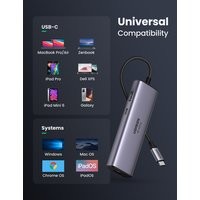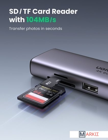 Концентратор UGREEN 7 в 1 USB-C оснащен портом Ethernet 1000 Мбит/с, портом HDMI 4K@60 Гц, портом для зарядки USB C с мощностью 100 Вт, устройством чтения карт SD/TF и 2 портами USB 3. 0. Подключайтесь к новейшим MacBook Pro или устройствам USB-C с помощью многопортового адаптера, чтобы обеспечить удобство в работе.Просто подключите порт HDMI, и вы сможете проецировать видеоконтент UHD 4K@60Hz/30Hz или Full HD 1080p 60Hz на HDTV, мониторы или проекторы. Проецируйте фильмы, презентации или видеоигры на мониторы в один клик. (Примечание: 4K@60Hz доступно только для ноутбуков с поддержкой DisplayPort 1.4 и 8K).Док-станция оснащена встроенным входом Type-C, что позволяет заряжать устройства, имея доступ к нескольким периферийным устройствам. Мощность распределяется между всеми подключенными к док-станции устройствами USB-C и регулируется в зависимости от потребностей. Концентратор выдает около 95 Вт для зарядки подключенного ноутбука и 5 Вт для питания концентратора при подключении к 100-ваттному входу питания.Порт Ethernet 1000 Мбит/с обеспечивает более стабильное и быстрое подключение к проводной сети (Примечание: для получения скорости 1 Гбит/с требуется порт LAN маршрутизатора, кабель CAT5e и высокоскоростной драйвер Ethernet). Порт RJ45 может распознавать скорость интернета и автоматически настраивается на самый высокий уровень, независимо от того, является ли она 10/100/1000 Мбит/с.2* порта USB 3.0 поддерживают скорость передачи данных до 5 Гбит/с, достаточно быструю для передачи HD-фильмов за считанные секунды. Также идеально подходит для подключения клавиатуры, мыши, флэш-накопителей и других периферийных устройств, подключаемых через порт USB A. Устройство чтения карт SD TF (скорость до 104 Мб/с) для устройств USB-C/Type-C/Thunderbolt 3 для доступа к файлам с устройств чтения карт SD/TF.