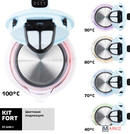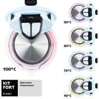 Электрический чайник с электронным терморегулятором Kitfort KT-640 может не только вскипятить воду, но и нагреть ее до температуры 40, 70, 80 и 90 °С, что очень удобно при заваривании различных сортов чая. Температура 40 °С пригодится для приготовления детского питания. Чайник также оснащен функцией поддержания температуры. Температура воды контролируется встроенным в дно чайника термодатчиком.