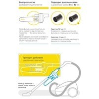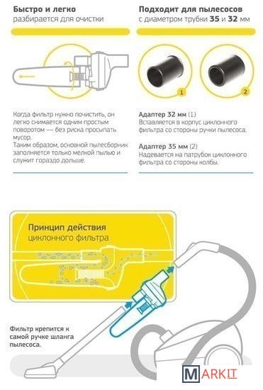 Комплектация циклонный фильтр, 2 адаптера для удлинительных трубок пылесоса 32 и 35 мм в диаметре