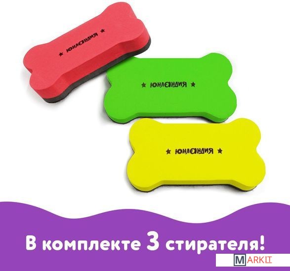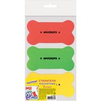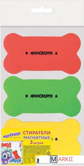 Стиратели магнитные ЮНЛАНДИЯ предназначены для стирания сухим способом надписей, сделанных маркером, с белых досок.Встроенный магнит позволяет расположить стиратель в любом месте рабочей поверхности доски. Стиратель имеет эргономичную форму и необычный яркий дизайн. Размер — 55х110 мм. Стирающий слой выполнен из фетра. Поставляется в упаковке с европодвесом. В комплекте 3 стирателя: красного, желтого и зеленого цвета. Внимание: стирать надписи с доски рекомендуется лёгкими круговыми движениями.