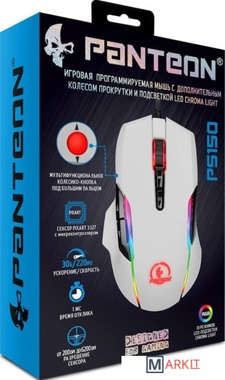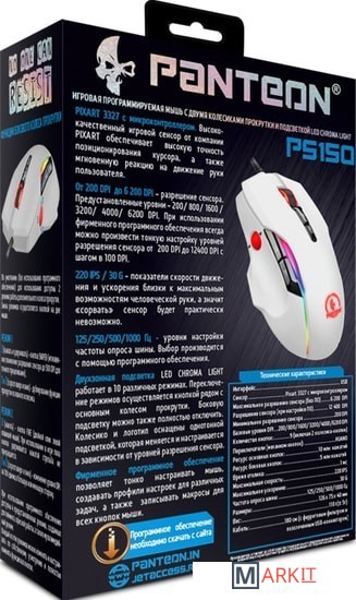 Ножки выполнены из тефлона высочайшего качества, тщательно обработаны, края скруглены, без всяких неровностей и заусенцев, поэтому мышь скользит как по маслу.По умолчанию (без использования программного обеспечения) для использования доступны 2 режима работы дополнительного колеса прокрутки.Смена режимов осуществляется кнопкой на дне мыши. Режим 1:3 (нажать и удерживать) - кнопка SNIPER (мгновенное понижение разрешения сенсора до 500 DPI для точного прицеливания).1 и 2 (скролл вверх и вниз) - дублирование функции прокрутки основного колесика.Режим 2:3 (нажать) - кнопка FIRE (двойной клик левой клавишей мыши). При использовании в игре пока кнопка удерживается нажатой стрельба не прекращается.1 и 2 (скролл вверх и вниз) - изменение уровня DPI на 100 единиц в большую или меньшую сторону.При использовании программного обеспечения доступны 4 предустановленных режима, созданных для гейминга, офисной работы, а также мультимедийный режим.Каждый из этих режимов можно изменять и настраивать по собственному усмотрению и полностью изменять функционал кнопок.