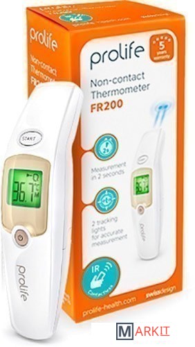 Бесконтактный инфракрасный термометр Prolife FR200 – быстрый и точный прибор для измерения температуры тела у детей и взрослых. Время измерения – 2 секунды. Термометром удобно и безопасно пользоваться: благодаря бесконтактному способу измерения (без прикосновения к коже) нет необходимости в дезинфекции прибора между измерениями температуры у разных членов семьи. Prolife FR200 оснащен световым индикатором, который помогает правильно направить прибор на область измерения. Подходит для измерения температуры тела, любых поверхностей и окружающей среды.Преимущества прибора Prolife FR200:- Световой индикатор правильного расположения прибора – для комфортного и точного измерения- Для измерения температуры тела, поверхностей, окружающей среды- Время измерения – 2 секунды- Память прибора: 30 измерений- Гарантия – 5 лет.