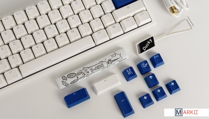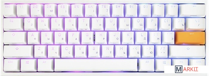 RGB подсветкаПрисутствует множество различных режимов, регулировка цвета осуществляется через палитру или отдельную настройку красного, зеленого, синего цветов. Также можно создать кастомный режим статичной подсветки.ПрограммируемаяDucky Macro 2.0 дает возможность создавать макросы. Можно создать свои мультимедиа, функциональные макросы и многое другое.Регулируемые ножкиДвойные регулируемые ножки предоставляют целых два угла наклона клавиатуры для более комфортной печати, а их прорезиненный низ не даст клавиатуре сдвинуться с местаРусифицированные PBT double-shot клавишиИзготовлены из высокопрочного пластика PBT с применением double-shot технологии, что гарантирует их долговечность и надежность в эксплуатации.DIP-переключателиДают возможность поменять расположение клавиши FN и переключиться между NKRO и 6KRO.Функция Full N-key Rollover по USB (NKRO)Позволяет нажимать одновременно неограниченное количество клавиш. Для печати идеально подойдет как 6KRO, так и NKRO независимо от вашей скорости. Для игр NKRO будет плюсом и неважно, нажимаете ли вы больше 6 кнопок или нет, поскольку, играя в любую игру, вы можете случайно нажать пару лишних клавиш и из-за этого клавиатура имеет шанс не среагировать на нажатие, которые вы хотели совершить изначально. Также присутствует возможность переключения на 6KRO. Информация о совместимости с Mac OS: функции клавиш Launchpad, Mission Control и регулировки яркости экрана отсутствуют. Управление музыкой недоступно по умолчанию (за исключением регулировки громкости), однако вы можете назначить действия управления музыкой на любые доступные для этого клавиши (например, FN + Z, X, C, V, B), следуя данной инструкции. Поменять местами клавиши-модификаторы можно в системных настройках Mac OS.