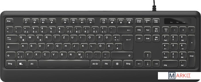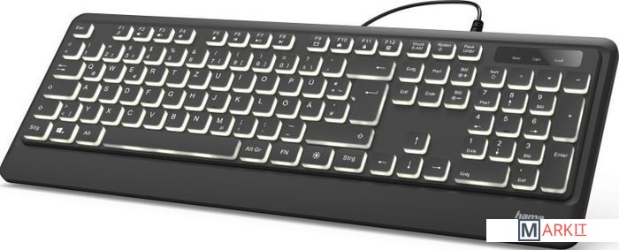 Клавиатура HAMA KC-550 подключается через разъем USB. Отличается удобной подсветкой клавиш, которая позволяет комфортно работать по ночам, не мешая отдыхать близким. Провод достаточно длинный, имеется удобная направляющая для него, в которую он укладывается и не мешает процессу работы. Для удобства пользователя есть специальные приспособления, позволяющие менять угол наклона устройства, достигая самого комфортного состояния. Устройство имеет квадратные, приятные на ощупь и легкие в нажиме клавиши. Расположены они в классическом порядке, хорошо разделены. Клавиатура HAMA KC-550 создана в классическом стиле, имеет черный цвет с приятной белой подсветкой. Буквы на раскладках английской и русской нанесены белой краской.