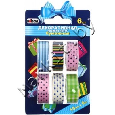 Клейкая лента декоративная Unibob 51716 15мм x 5м ассорти, бумажная, 6 шт. Код: 33403