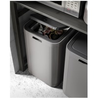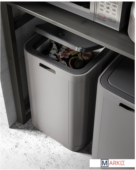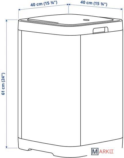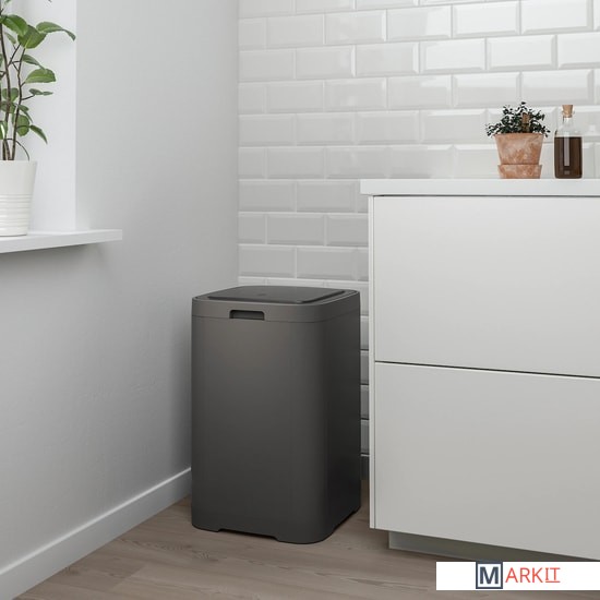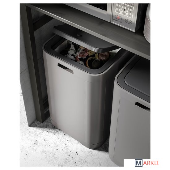 Легко открывается нажатием на крышку.Благодаря квадратной форме для контейнера легко найти место на кухне, например в углу или около рабочей поверхности, а также при необходимости можно поставить несколько контейнеров в ряд.Когда мешок заполнится мусором, нужно просто поднять крышку и вынуть раму, фиксирующую мешок.Практичное решение для объемного мусора, например коробок или бутылок.Используйте контейнер с мешками для мусора.