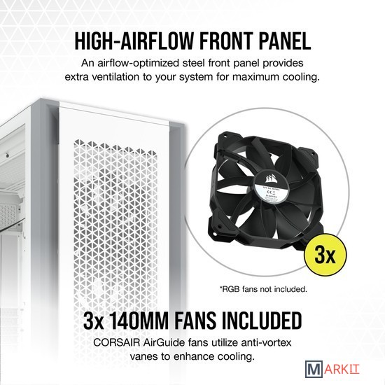 CORSAIR 7000D AIRFLOW — это корпус формата Full-Tower ATX для создания наиболее амбициозных сборок, обладающий невероятным потенциалом охлаждения благодаря оптимизированной для нагнетания воздушного потока стальной передней панели и оснащенный системой скрытой прокладки кабелей и тремя входящими в комплект вентиляторами CORSAIR AirGuide.Вместительное внутреннее пространство, мощный воздушный поток и продуманный дизайн корпуса 7000D AIRFLOW открывают целый мир возможностей для создания авторской неповторимой сборки.Повторитель ШИМ-сигнала вентилятора управляет вентиляторами, входящими в комплект поставки (всего их можно подключить до шести штук). Уменьшайте скорость вращения вентилятора, когда вам необходима бесшумная работа системы, или увеличивайте ее для работы в высокопроизводительном режиме — и все это с помощью одного 4-контактного ШИМ-разъема на материнской плате.Две стальные панели, обдуваемые мощным воздушным потоком, и прочная боковая панель из закаленного стекла толщиной 4 мм обеспечивают превосходное охлаждение и хороший обзор системы.Акцентируйте внимание на своей графической карте с помощью инновационного вертикального крепления для графических карт, которое отличается оптимальным размером для установки самых мощных современных графических карт и обеспечивает достаточное пространство для беспрепятственного воздухообмена.Оснащенный окошком кожух блока питания с возможностью персонализации позволяет увидеть все компоненты системы изнутри. Снимите панель, добавьте виниловую графику, нанесите свой логотип лазером или установите подсветку, чтобы придать вашей системе индивидуальности.Быстро и легко уложите основные кабели в один просторный потайной канал глубиной 25 мм за материнской платой, предусмотренный для всех кабелей, которые легко скрыть за откидной стальной дверцей.