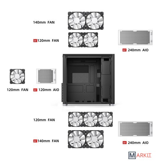 Конфигурация вентиляторов сверху 120mm*2 or 140mm*2сзади 120*1mmснизу 120mm*3 or 140mm*2
