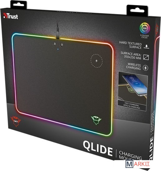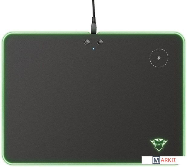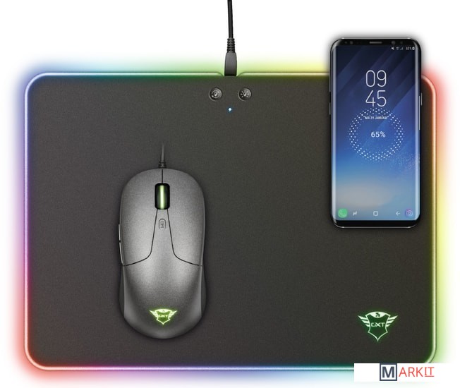 Данный коврик оснащен функцией беспроводной зарядки стандарта Qi. Благодаря этому его можно использовать не только для подзарядки мышки, но и мобильного телефона. Также оснащен кнопками управления подсветкой.