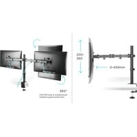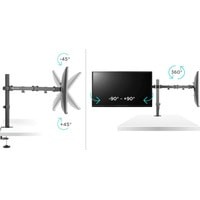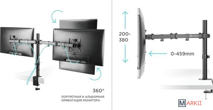 Функциональные особенности поворотный, кабель-канал, струбцинное крепление, для 2 мониторов / поворотный, кабель-канал, струбцинное крепление
