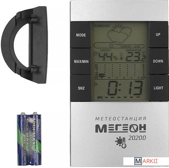 - Метеостанция МЕГЕОН 20200 - 1 шт.- Батарея 1,5В тип ААА - 2 шт.- Руководство по эксплуатации - 1 экз.- Гарантийный талон - 1 экз.