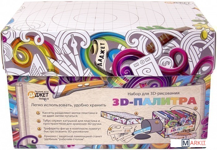 3D-палитра WATSON - это 10 кассет по 10 метров пластика, комплект трафаретов и специальный тубус, в который можно убрать 3D-ручку после работы. Все укомплектовано в специальный контейнер. Идеальное решение для работы и хранения комплектующих!