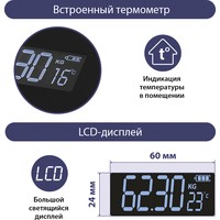 | Функциональные особенности | расчет доли воды, расчет доли жировой ткани, расчет доли мышечной ткани, расчет доли костной ткани, расчет ИМТ (BMI), индикация температуры помещения, индикация заряда батареи |