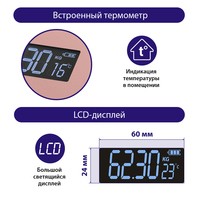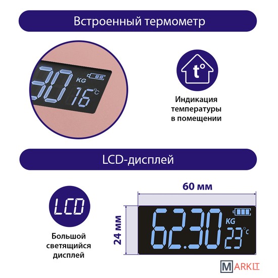 | Функциональные особенности | расчет доли воды, расчет доли жировой ткани, расчет доли мышечной ткани, расчет доли костной ткани, расчет ИМТ (BMI), индикация температуры помещения, индикация заряда батареи |