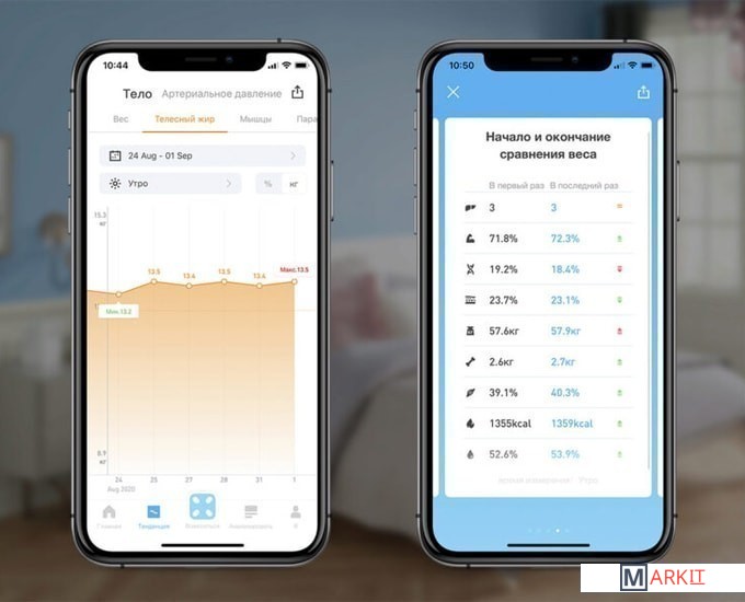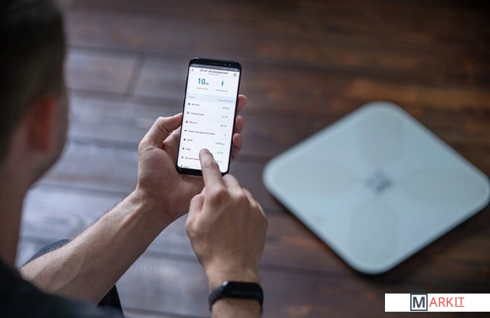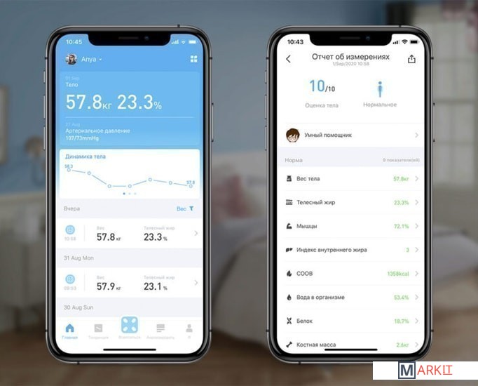 расчет доли воды, расчет доли жировой ткани, расчет доли мышечной ткани, расчет доли костной ткани, расчет ИМТ (BMI), расчет уровня белка, расчет биологического возраста, пульс (в приложении)