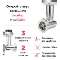| Комплектация | - 3 решетки для фарша: 3 мм, 4.5 мм, 8 мм; - насадка для колбасы; - насадка-кеббе. |
