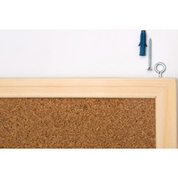 Пробковая доска в деревянной рамке. Поверхность доски из натуральной мелкозернистой пробки. Возможность прикрепления информации с помощью кнопок-гвоздиков и булавок. Рамка из натурального дерева. Скрытое крепление к стене в двух углах.