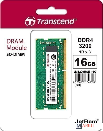 Markit » Оперативная память » Оперативная память Transcend JetRam 16GB DDR4 SODIMM PC4-25600 JM3200HSE-16G