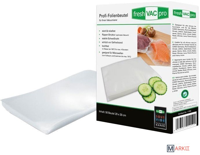 Комплектация 50 профессиональных пакетов размером 20 x 30 см для вакуумной упаковки.