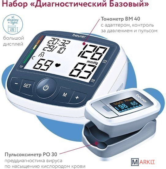 В набор входят:1. Пульсоксиметр Beurer PO 30настраиваемая яркость дисплея;цветной дисплей с 4 режимами;графическое отображение пульса;удобен в дороге;7 форматов дисплея;индикатор заряда батареи;2. Тонометр на плечо Beurer BM 40 (с сетевым адаптером)https://catalog.onliner.by/tonometers/beurer/bm40adapterизмеряет, сохраняет, усредняет (все сохраненные значения, значения утро/вечер за последние 7 дней);имеет встроенную пользовательскую память – 2х60 измерений,;определяет аритмию;имеет шкалу идентификации результата относительно нормального значения артериального давления (индикатор риска);отображает дату/время на дисплее при включенном тонометре;автоматически отключается при бездействии;контролирует и отображается уровень разряда батареи.