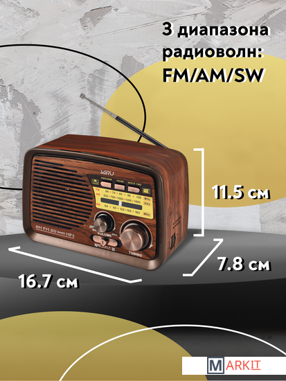 Радиоприемник MIRU SR-1027 коричневого цвета имеет ретро дизайн, простой функционал и обеспечивает приём сигналов в диапазоне FM, AM и SW. Аналоговый способ настройки частоты предполагает более точное и быстрое улавливание нужного канала. Для улучшения качества сигнала у радиоприемника имеется поворотная телескопическая антенна. Радиоприемник SR-1027 может работать как от сети 220В и аккумулятора, так и от двух батареек типа R20(D). Органы регулировки громкость и смена диапазонов расположены на передней панели приемника. Также предусмотрено проигрывание с USB и microSD накопителей. Данный радиоприемник отлично подойдет для туристов, дачников и просто любителей отдыха на природе.