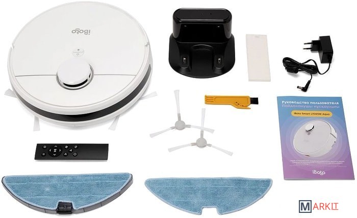 Комплектация зарядная станция, адаптер питания, пульт ДУ, щеточка для очистки, документация, салфетки из микрофибры (2 шт), боковая щетка (2 шт), фильтр