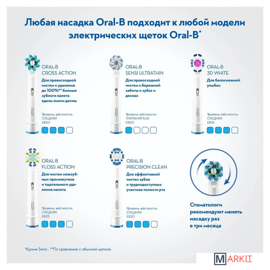 Совместимые модели Подходит ко всем электрическим зубным щеткам Oral-B, кроме звуковых электрических зубных щеток Oral-B Sonic/Pulsonic, а также Oral-B iO Series.