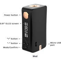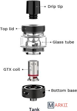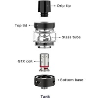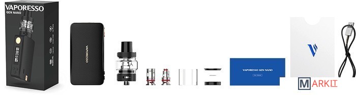 Комплектация • 1 x GEN NANO MOD• 1 × GTX TANK 22 (3,5 мл)• 1 x GTX 0,2 Ом MESH coil• 1 x GTX 0,6 Ом MESH coil• 1 x Стеклянная трубка (2 мл)• 3 × Уплотнительное кольцо• 1 x USB кабель• 1 × Карта-памятка спирали GTX• 1 × Инструкция• 1 × Гарантийная карта