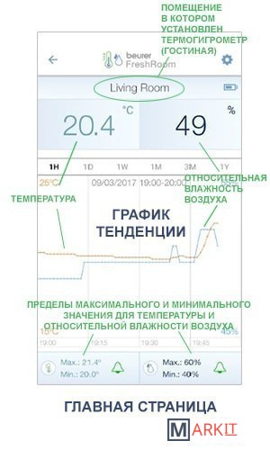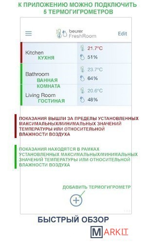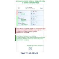 | Особенности | Синхронизация с приложением Beurer FreshRoom по Bluetooth. Многокомнатная индикация: при помощи приложения можно подключить и управлять одновременно 5 термогигрометрами и дать им разные наименования (например, «кухня» или «гостиная»). |
