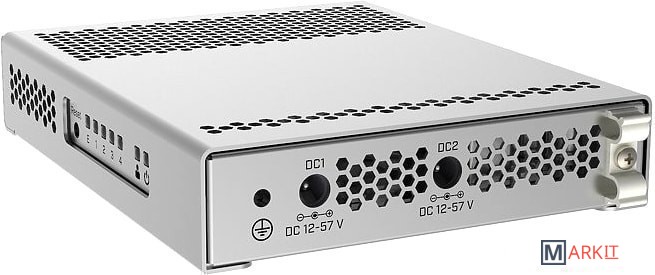 Cloud Router Switch CRS305-1G-4S+IN - 5-ти портовый управляемый коммутатор 3 уровня, 1x10/100/1000 RJ45 ports с поддержкой PoE, 4xSFP+ ports, два независимых входа DC IN (11-57В) для бесперебойного питания.